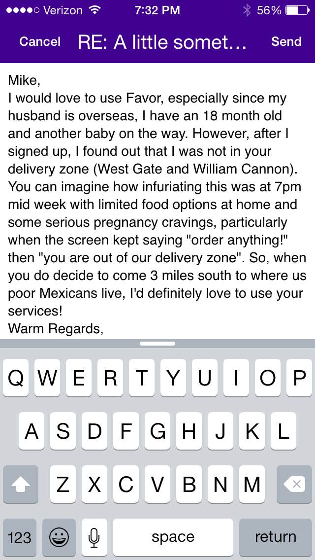So, when Favor, the new App that boasts food delivery from anywhere to anywhere, emailed me to ask them why I signed up for their service but haven’t used it yet, I had no problem sending this email: